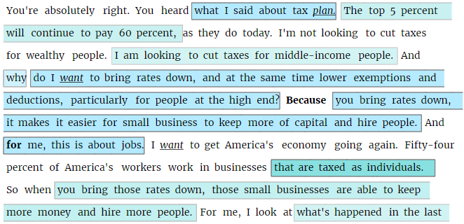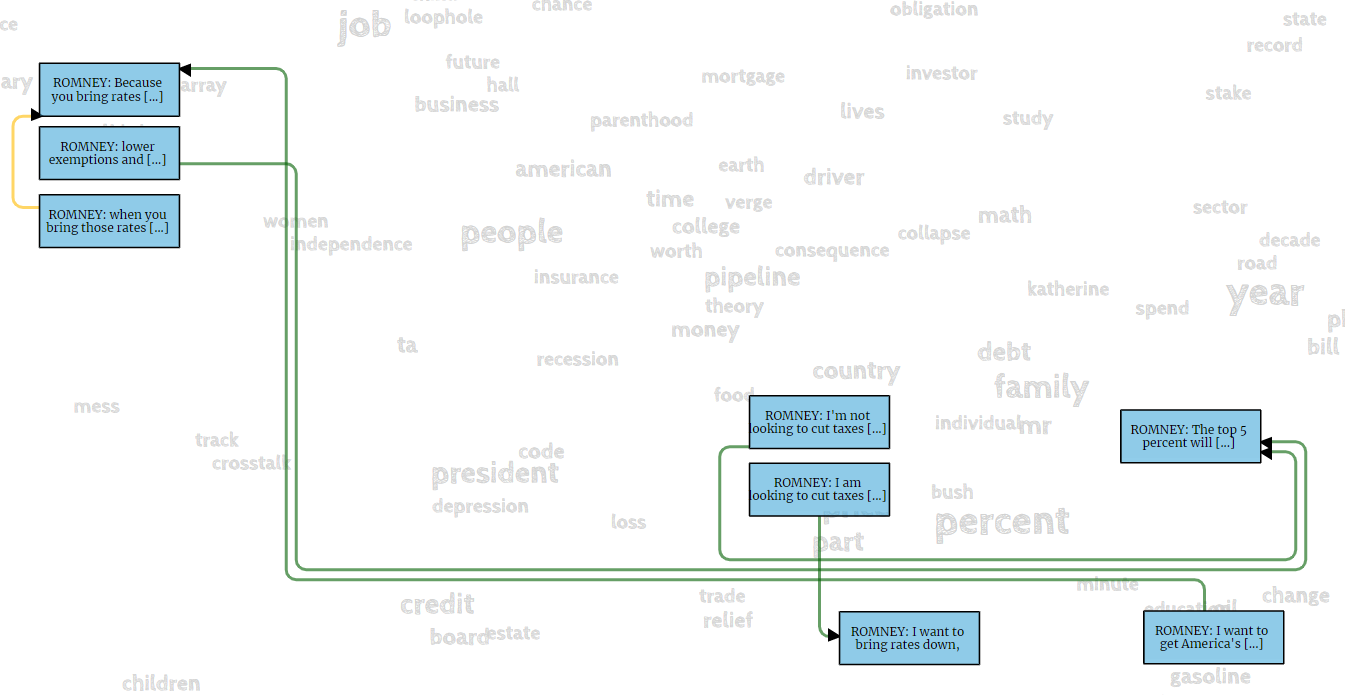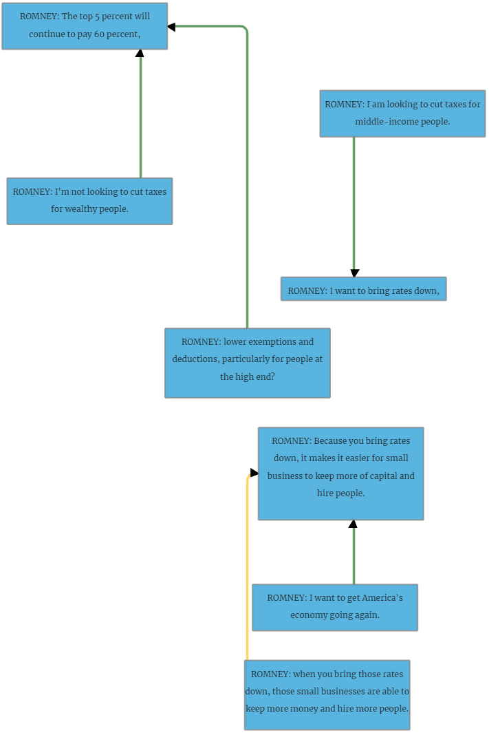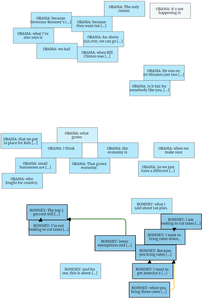 For argument reconstrcution the nodes of the graph are replaced with ones containing propositions reconstructed from the locutions. Double-clicking any node enables in-place reconstruction, and new relations can still be added by drawing the connections.