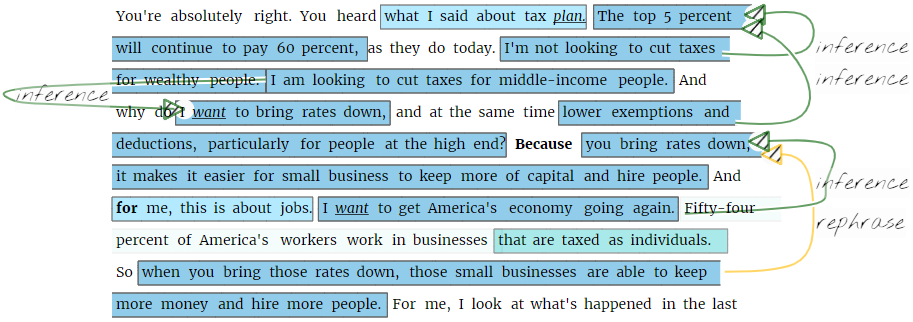 A specific view tailored to relationship extraction hides the original text and shows a locution-graph instead. New relations can easily be added by drawing lines between graph nodes.
